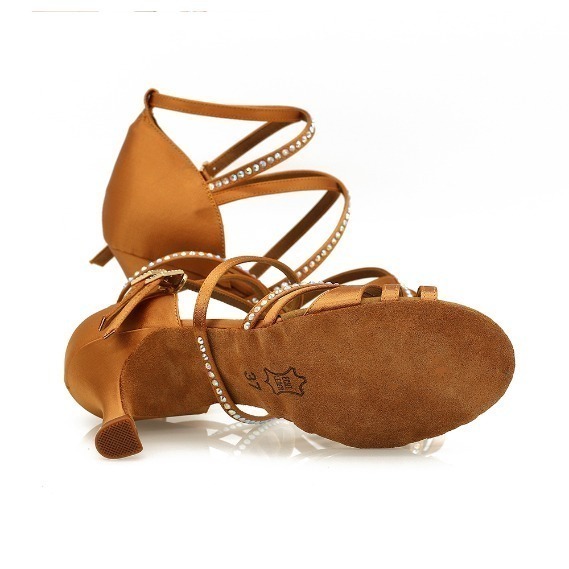 De schoenen zijn gemaakt van donker brons satijn bedekt met kristallen en bestaan uit meerdere fijne bandjes die de voet optimaal omsluiten. De dansschoenen sluiten door middel van dubbele enkelbandjes met kristallen gespje en hebben een antishock binnenzool uiterst comfortabel, geschikt voor alle soorten dansstijlen.